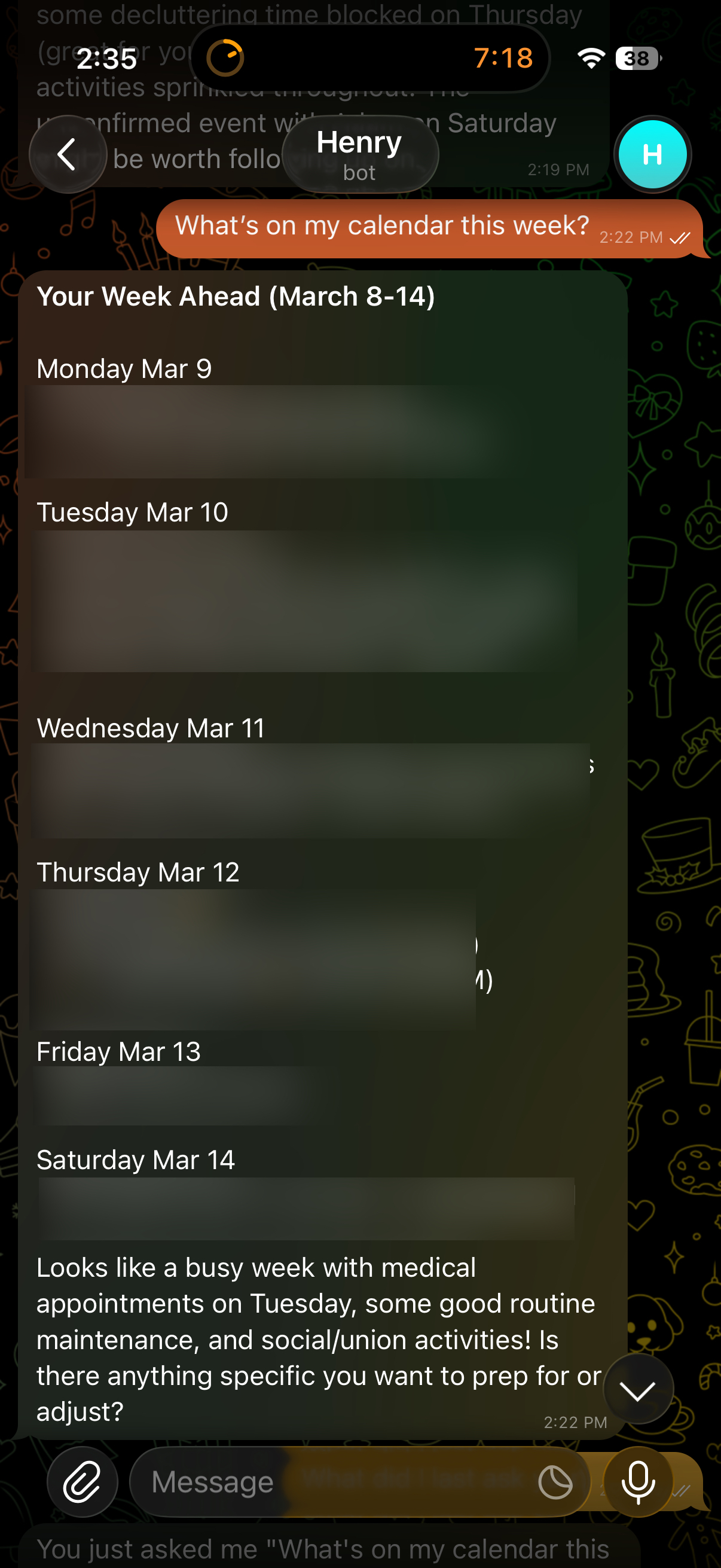 Next up, for my Bot project, I needed to get Claude looking at my calendar. To do this I setup specific credentials with FastMail that have access to my calendar -- read access for now. I installed a CalDAV library for Python, and then, using code Claude wrote, updated my bot.